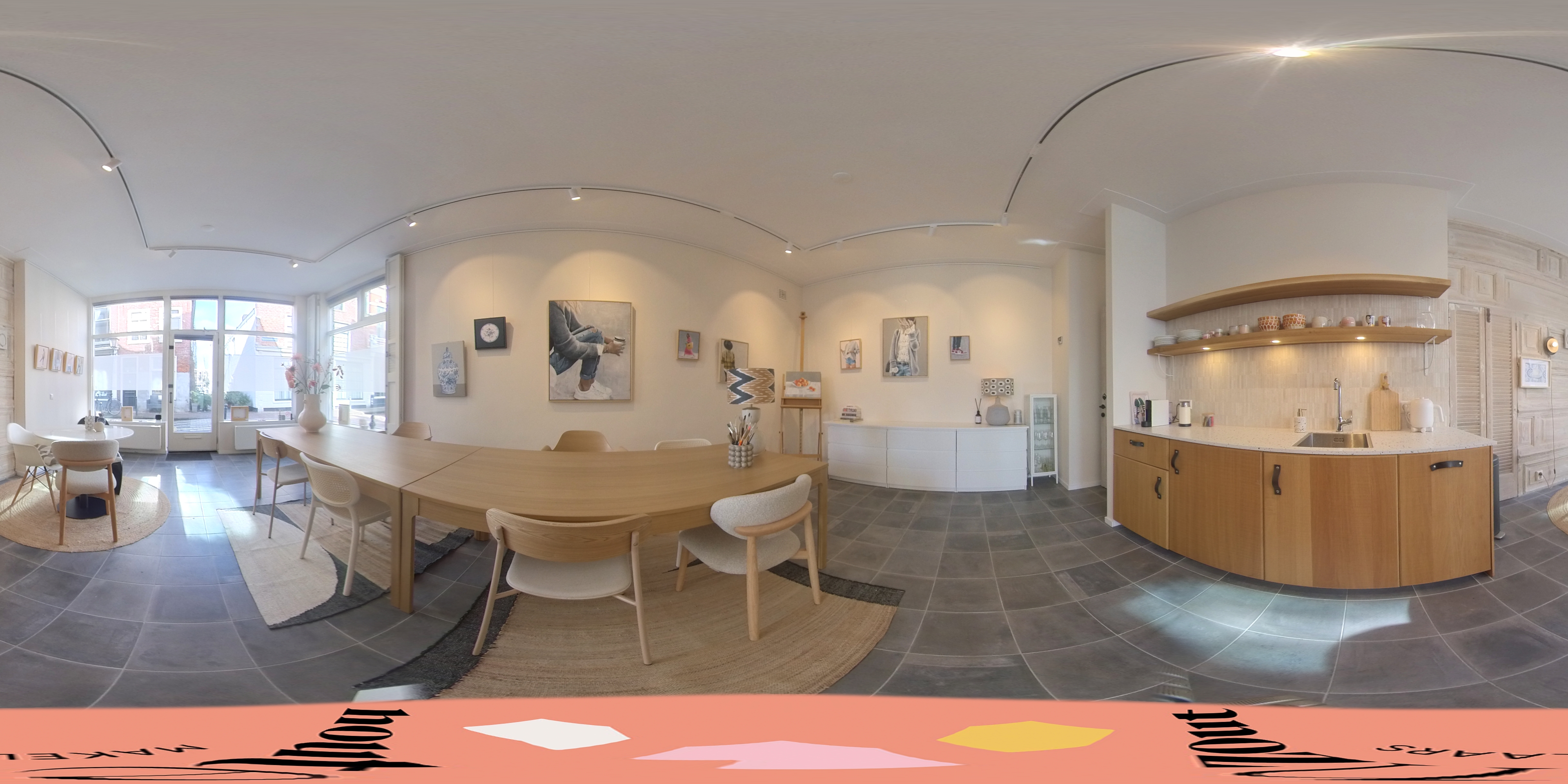 Spacious and bright area, currently used as a gallery and office, with under-stairs storage cupboard and utility meter cabinet. Open kitchen (2025) equipped with refrigerator, dishwasher, and sink. The bathroom features a toilet, two washbasins, a generous walk-in shower, and a cupboard housing the central heating boiler.